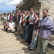 Nettoyage du carrelage de terre cuite du 15e siècle, formant le sol de la grande salle du logis. Vue aérienne du château en 2009.